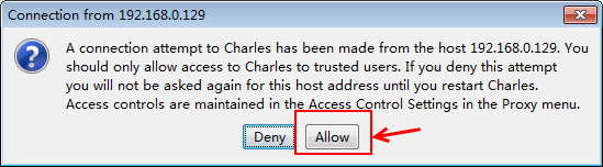 第一次设置成功代理后,随便打开一个需要网络的应用,PC端会自动弹出以下提示,选择allow允许Charles代理