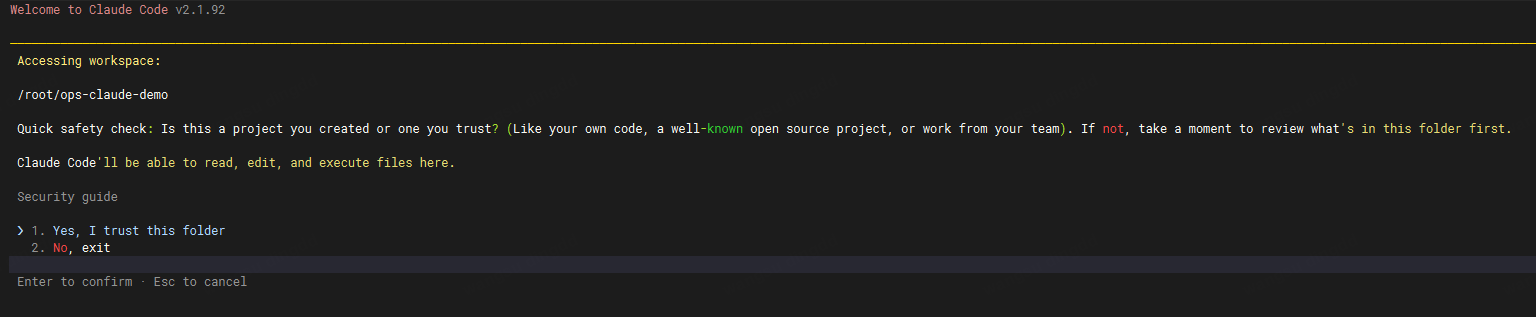 /root/ops-claude-demo(这是你当前所在的项目文件夹)快速安全检查:这是你创建的项目,还是你信任的项目?(比如你自己的代码、知名开源项目、或你团队的代码)。如果不是,请先花点时间检查一下这个文件夹里有什么。