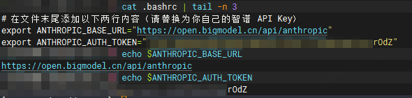 确保你之前在 ~/.bashrc 中配置的智谱 API Key 已经生效: