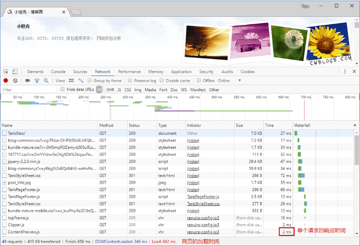 从图5-2中可以看出单个请求的响应时间,可以看到这个网页发送了49个请求。总的网页响应时间是682毫秒,性能非常好。