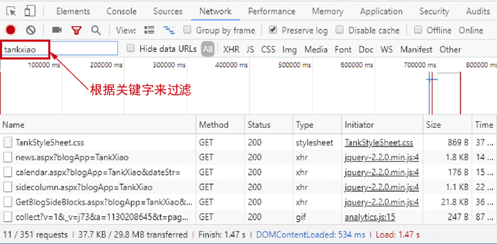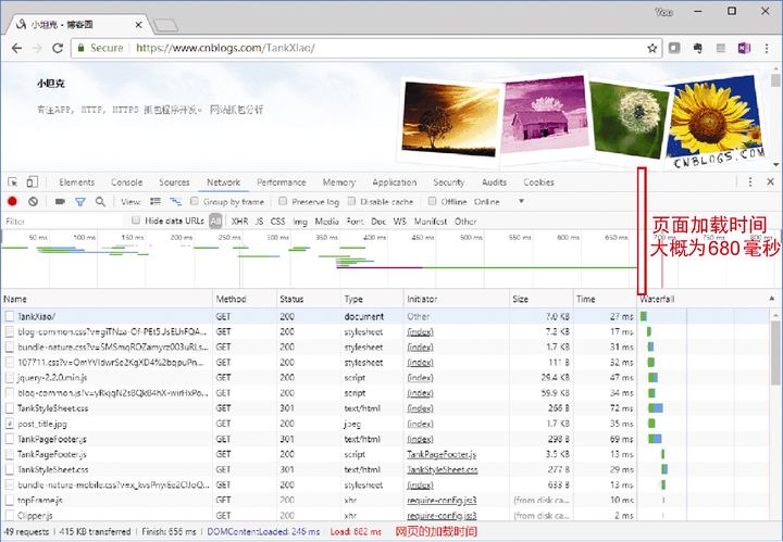(2)访问一个网址,比如访问http://www.cnblogs.com/tankxiao,开发者工具能捕获所有的HTTP请求,如图5-2所示。