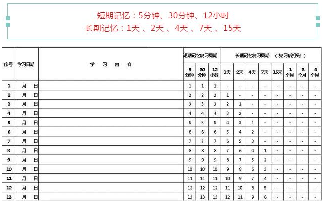 将自己每天学习的知识编号,编号为图中的1、2、3......,之后再根据记忆表后面的时间、序号提示来复习,就可以啦!